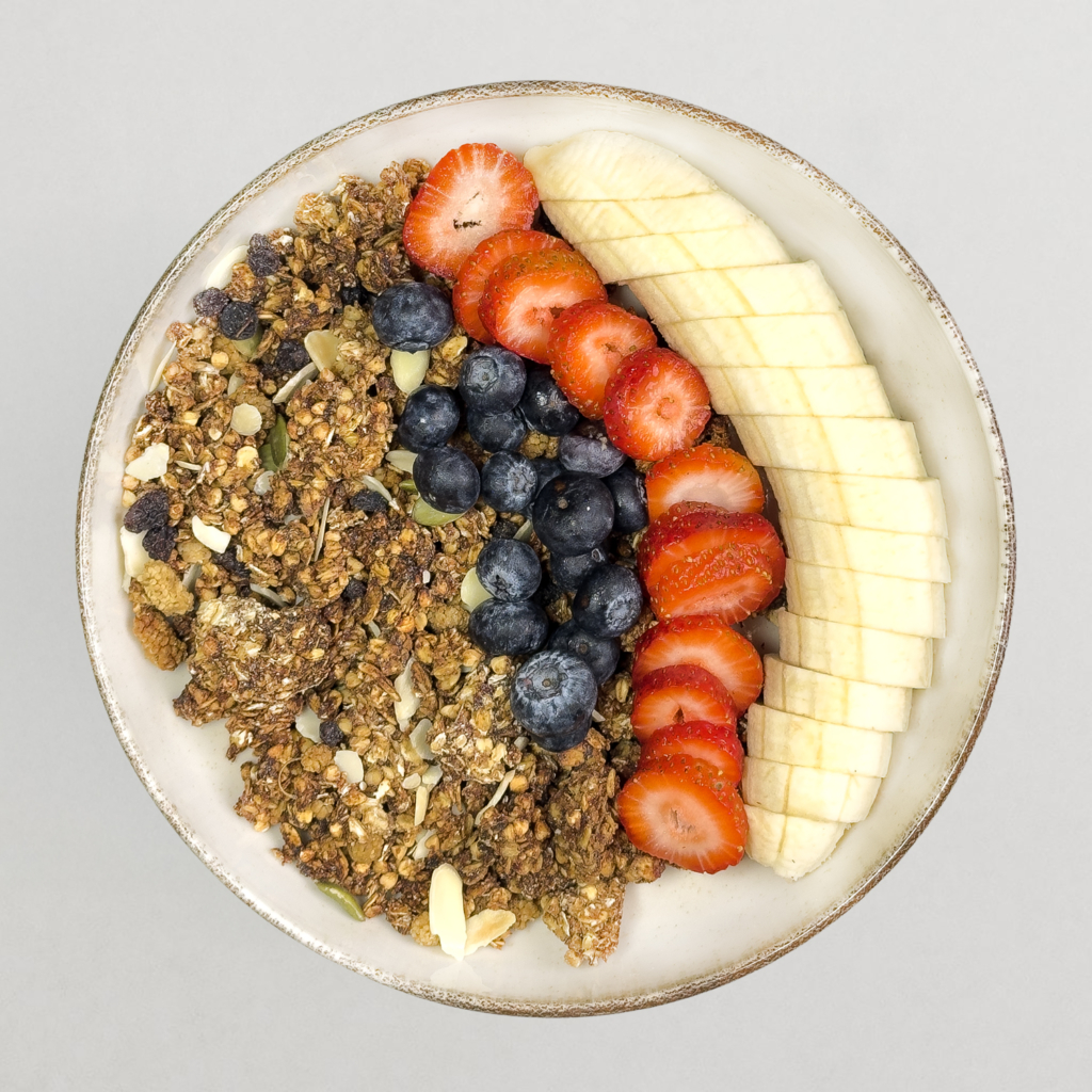 Filizilendirilmiş Karabuğdaylı Şekersiz Granola, Taze Mevsim Meyveleri, Süt veya Yoğurt ile