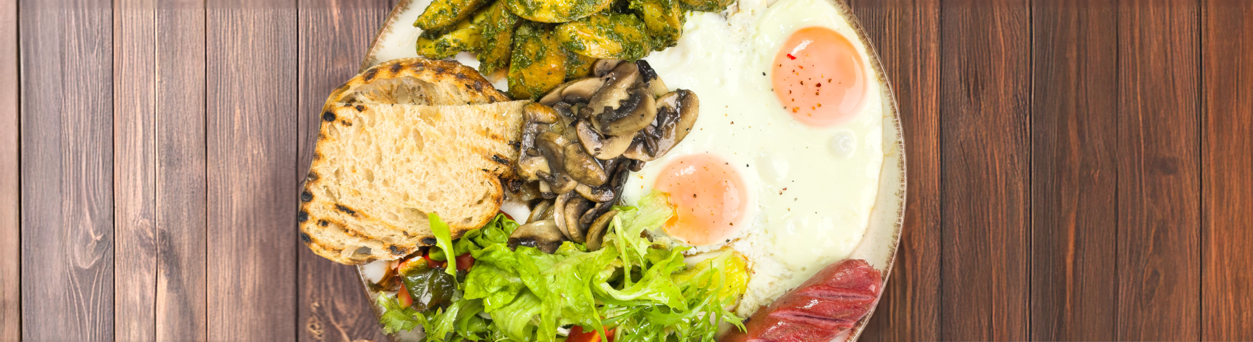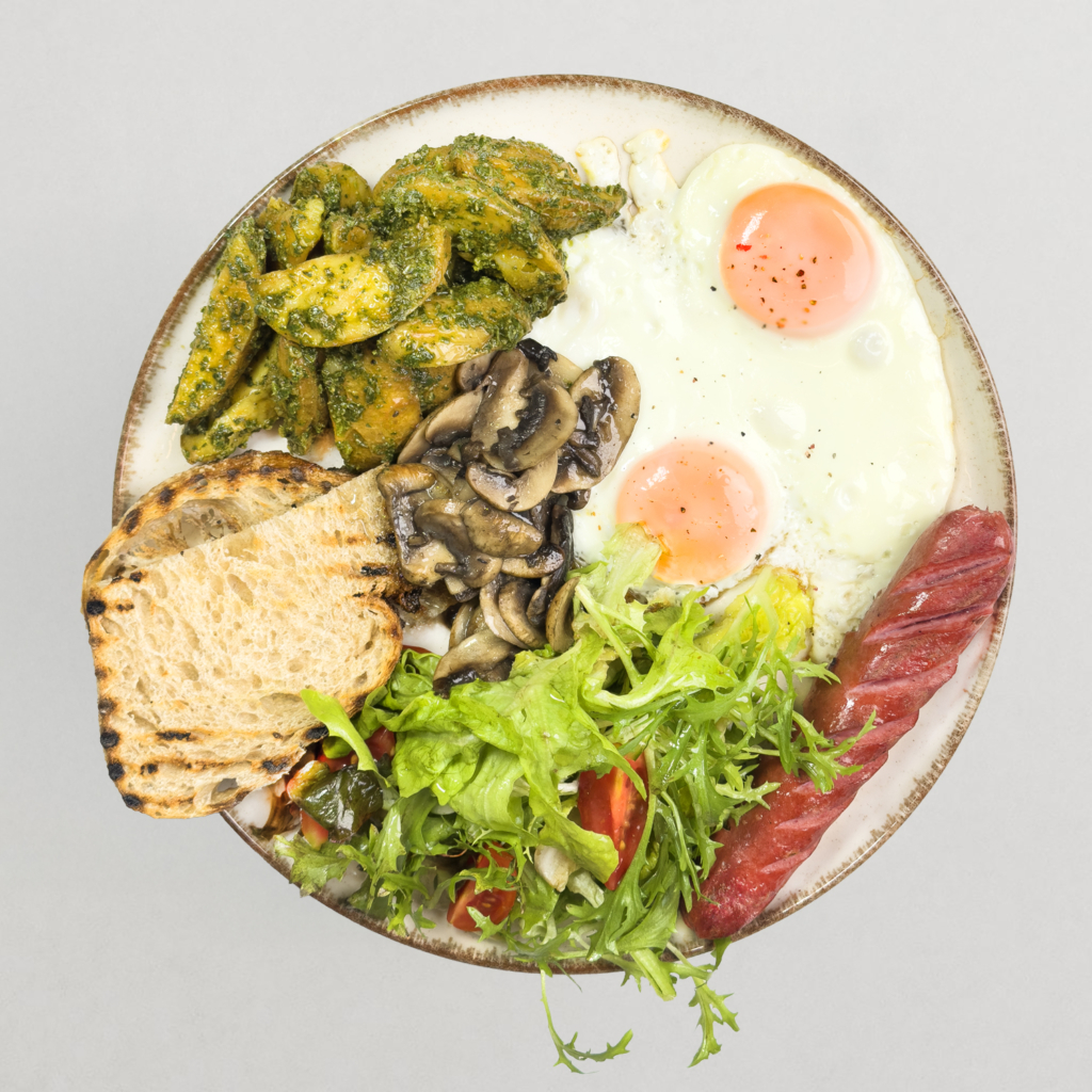 Göz yumurta, Mantar Sote, Dana Bratwurst Sosis, Pesto Soslu Fırın Patatesi, Mevsim Yeşillikleri, Kızarmış Ekmek